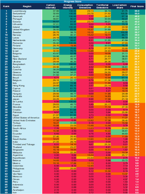 - Assessment of 69 countries across five indicators, measuring current performance and speed of green transition
