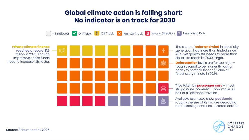 واشنطن (22 تشرين الأول/أكتوبر 2025) - خلص تقييم رئيسي حديث إلى أن العالم يتعثّر في إحراز تقدم للحدّ من الاحتباس الحراري إلى 1.5 درجة مئوية، مع عدم وجود أي من مؤشرات العمل المناخي الـ45 على المسار الصحيح لعام 2030.